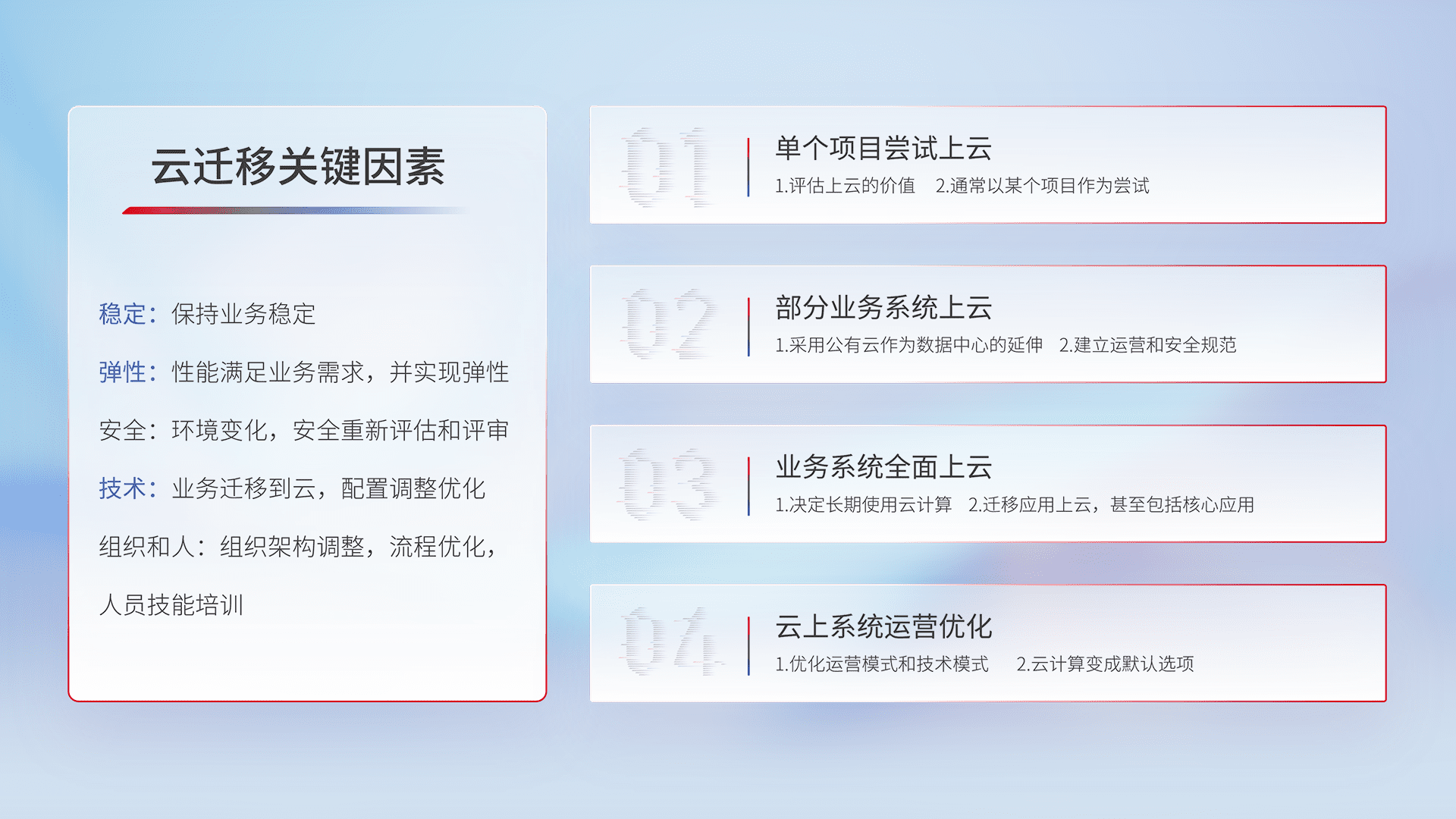 结合实际业务,,,,从规划设计、、、云平台选型、、、、云原生改造、、数据迁移、、、集成交付,,,,迁移全过程为客户识别最佳上云路径,,,,做好风险识别管理,,,设计网络架构、、身份权限、、、安全审计合规、、、操作审计、、日志审计、、、监控告警策略、、多站点容灾设计等,,对云上基础设施进行整体规划,,,提升IT治理水平,,,以满足弹性、、、高可用、、、高性能的需求。。。。