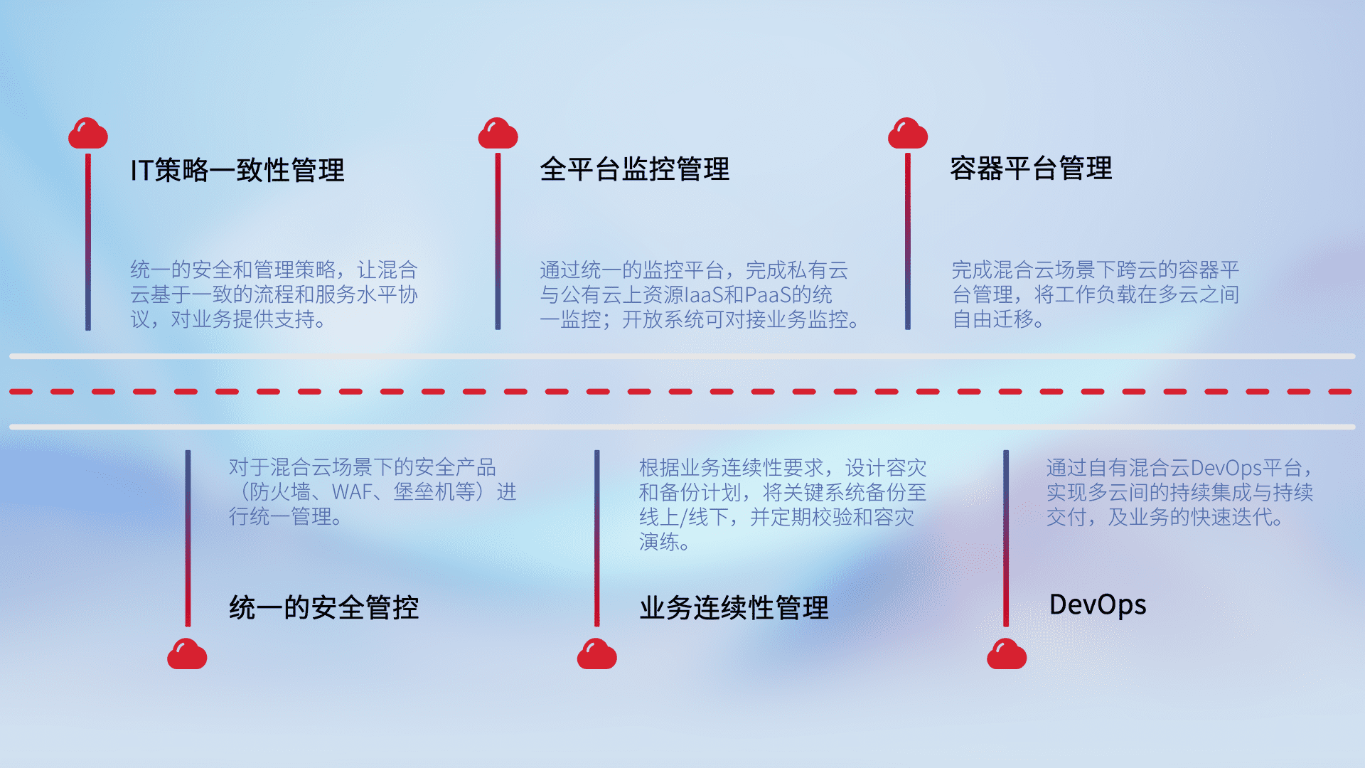 通过多云纳管,,,以统一的资源数据模型把客户的云资源进行抽象和封装,,,进而实现对多云资源的统一操作,,保障云资源管理的可靠性、、、稳定性与可用性。。。量身定制化运维内容,,,配置、、开发运维、、补丁管理、、、、备份、、、、监控、、认证和访问管理、、审计和日常巡检等,,,,保障在用云过程中的可靠度,,稳定度以及高可用率。。